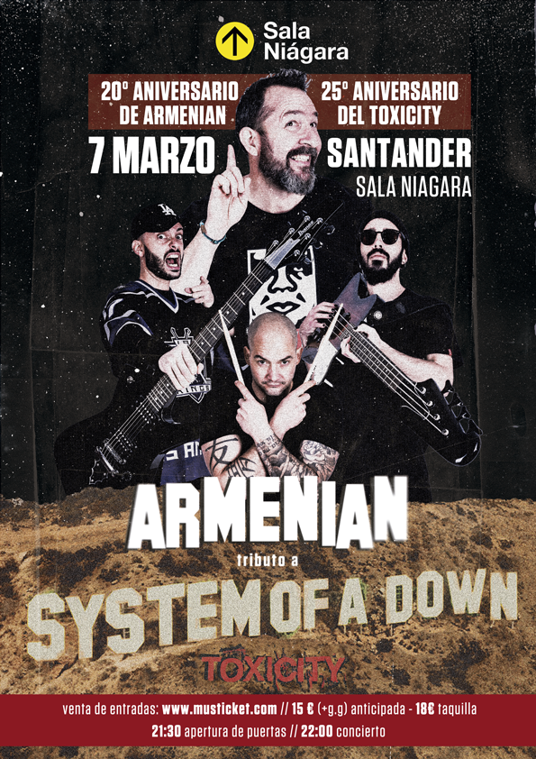 La banda zaragozana ARMENIAN, tributo a System of a Down, regresa presentando su gira 20º aniversario. En 2026, coincidiendo con el 25º aniversario del lanzamiento del álbum Toxicity de SOAD, prepárate para disfrutar de un espectáculo especial en el que podrás revivir todos los éxitos de ese álbum, sin olvidar el resto de su discografía: Toxicity, Chop Suey, Aerials, Sugar, BYOB, Lonely Day, IEAIAIO, Spiders y muchos más, además de algunas sorpresas... ¡No te quedes sin tu entrada!